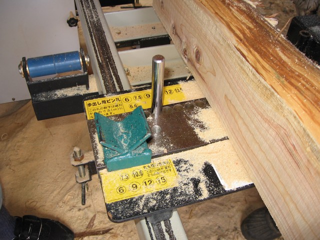 | 材の太さに合わせて、刃を押さえる高さを調整します。材に比べて刃の切れ幅が大きいと、切っている途中で刃がたわみ、切り初めと切り終わりでは随分誤差がでてしまうようです。 |