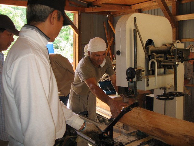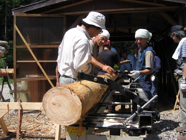 緑色のV字台を目盛に合わせてセットし、この上に丸太を載せます。V字の先端に中心がくるように載せます。この時、左右の曲がりがない方向で材を載せるのがコツです。 |