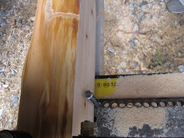 | 材の切り終わりは、鋸幅を通り過ぎないように注意してください。行き過ぎると、材を戻してくるときに鋸に引っかかってしまいます。切っている時点で材が反り始めていて、鋸をたわます力がかかっているようです。 |